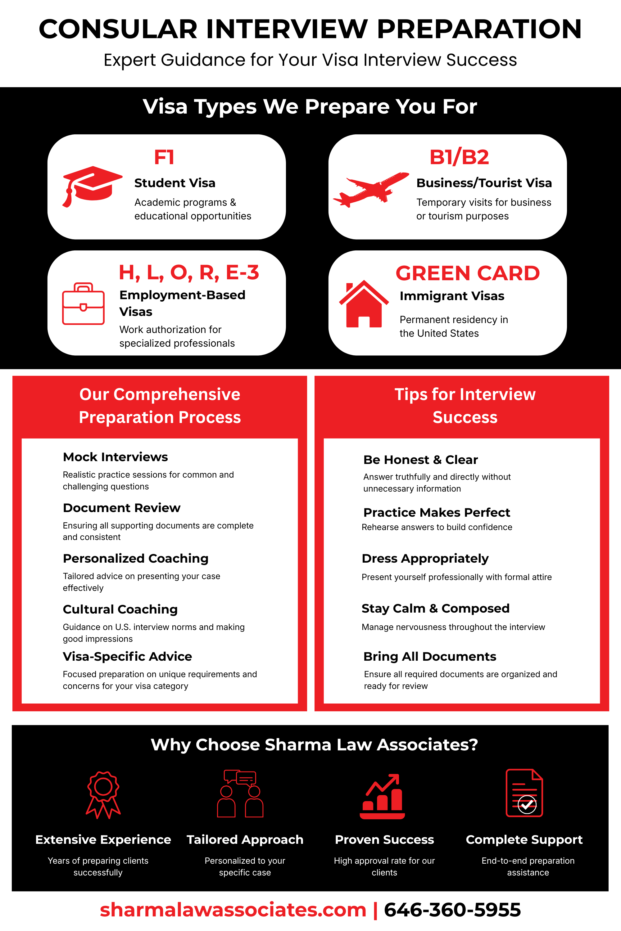 Preparing for a consular visa interview can be a stressful process, but with the right guidance, you can confidently face the interview and increase your chances of success. At Sharma Law Associates, LLC, we specialize in preparing individuals for a variety of visa interviews, including F-1 (student), B1/B2 (business/tourist), H-1 (employment-based), L-1 (intra-company transferee), and Green Card interviews. Our goal is to provide you with personalized coaching and practical advice to ensure you're well-prepared.